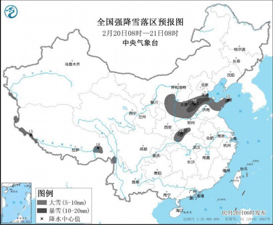 预计2月20日08时至2月21日08时,陕西北部、山西中南部、河北中南部、山东中东部和北部、河南北部和西南部、湖北西北部、西藏西部和东南部等地的部分地区有大雪,其中,山西东南部、河北南部、山东西北部和东部、河南西南部、湖北西北部等地的部分地区有暴雪(10~19毫米)。上述部分地区新增积雪深度3~7厘米,局地可达10厘米以上。
