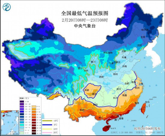 中新网2月20日电 据中央气象台网站消息,中央气象台2月20日6时继续发布寒潮橙色预警:受寒潮影响,预计,2月20日至2月23日,我国中东部大部将自北向南先后出现降温,日平均或最低气温普遍下降8~12℃,华北南部、黄淮西部、江淮、江汉、江南、华南中北部及贵州等地气温将下降12~18℃,其中,湖南南部、贵州东部、广西北部等地的部分地区累计降温幅度可达20℃以上。2月23日前后,最低温度0℃线将南压到苏皖南部至湖南南部、贵州南部一带。