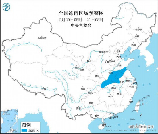 预计,2月20日08时至21日08时,河南中南部、山东南部、安徽北部、湖北北部和西部等地的部分地区有冻雨或冰粒,冻雨量1~5毫米,局地7毫米以上。