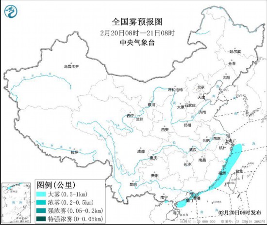 中央气象台2月20日6时继续发布大雾黄色预警: