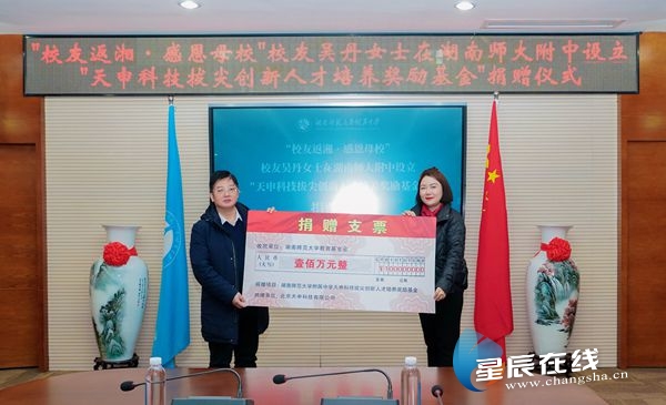 星辰在线2月27日讯(通讯员 莫晖 谭伟)2月26日,湖南师范大学2000级校友吴丹女士向湖南师大附中捐赠设立“天申科技拔尖创新人才培养奖励基金”。湖南师大附中党委书记谢永红,校长黄月初,副校长兼工会主席廖强,共青团长沙市委统战联络部部长徐力,亚太杰出女性联合会副会长、北京天申科技有限公司顾问、管理学博士后吴丹,以及北京天申科技有限公司企业方代表等出席捐赠仪式。