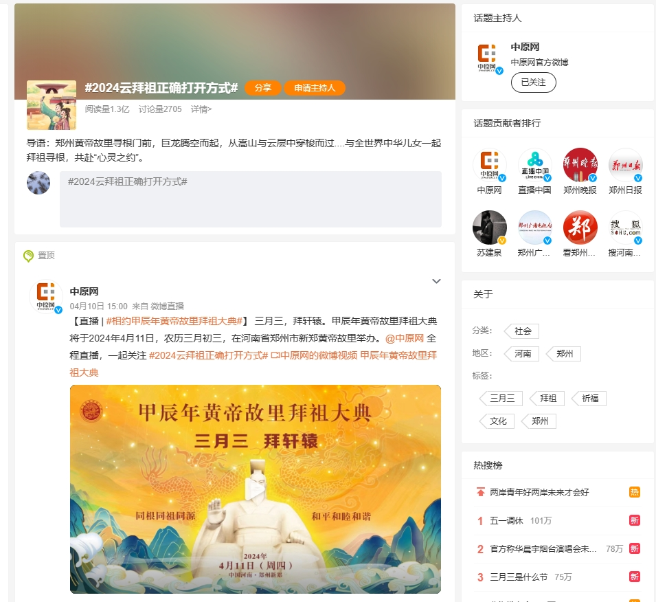 话题#2024“云拜祖”正确打开方式#登上了微博热搜,阅读量已经达到了1.3亿人次。随着敬献花篮、上香祈福、写祈福语、参与互动小游戏、观看拜祖大典现场九项仪程网络直播的网友越来越多,黄帝文化成了这个春天的“顶流”。