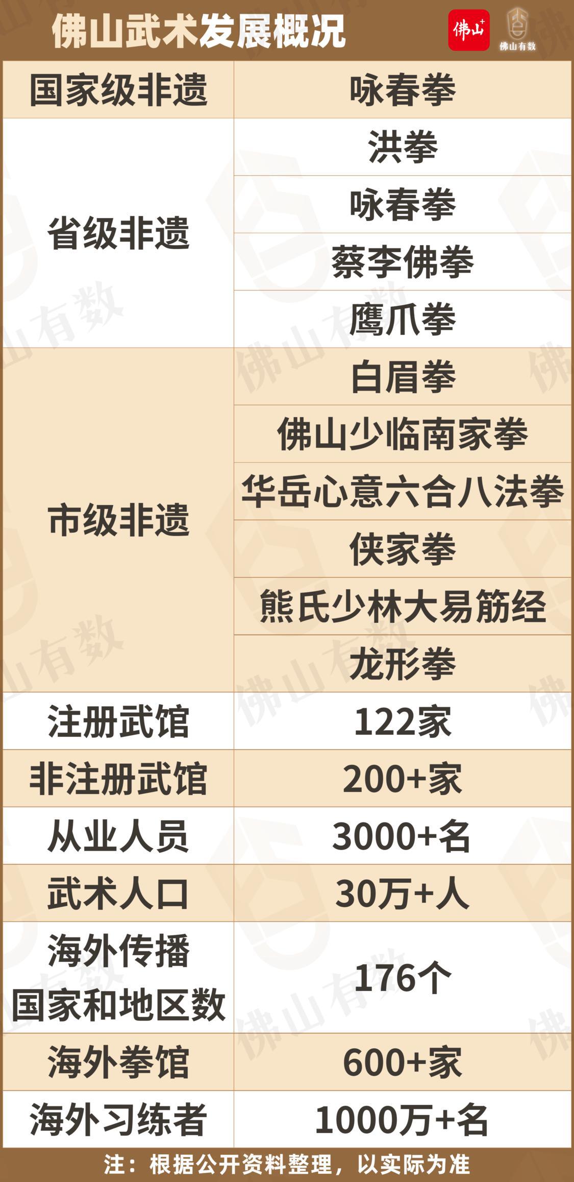 2004年,佛山荣膺全国唯一的“武术之城”称号。目前,佛山全市共有122家注册武馆、200余家非注册武馆、3000多名从业人员。