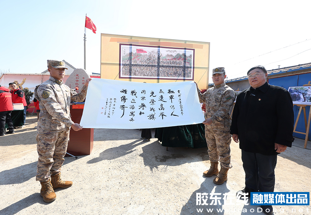 李刚)30日,龙口市丰仪店战斗展览馆门前,举行纪念丰仪店战斗83周年仪式。济南第一团“钢八连”指战员和丰仪店村父老乡亲及英烈后人,与53位抗日无名先烈画像合拍“全家福”,共同缅怀先烈,传承红色精神。