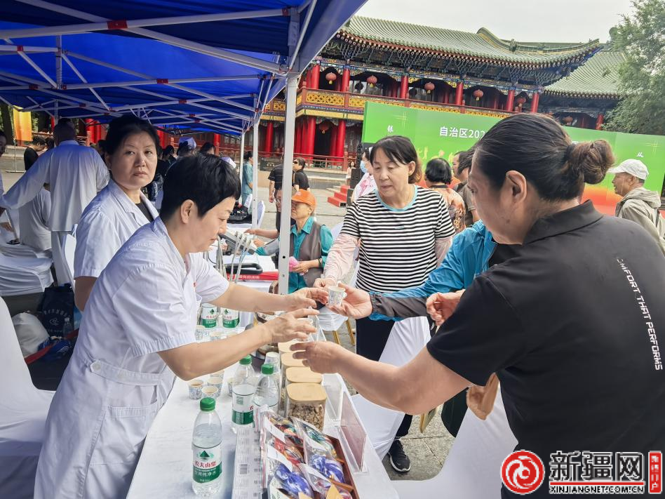 乌鲁木齐市中医医院提供的中医药茶吸引老年群众前来品尝。(薛玲摄)