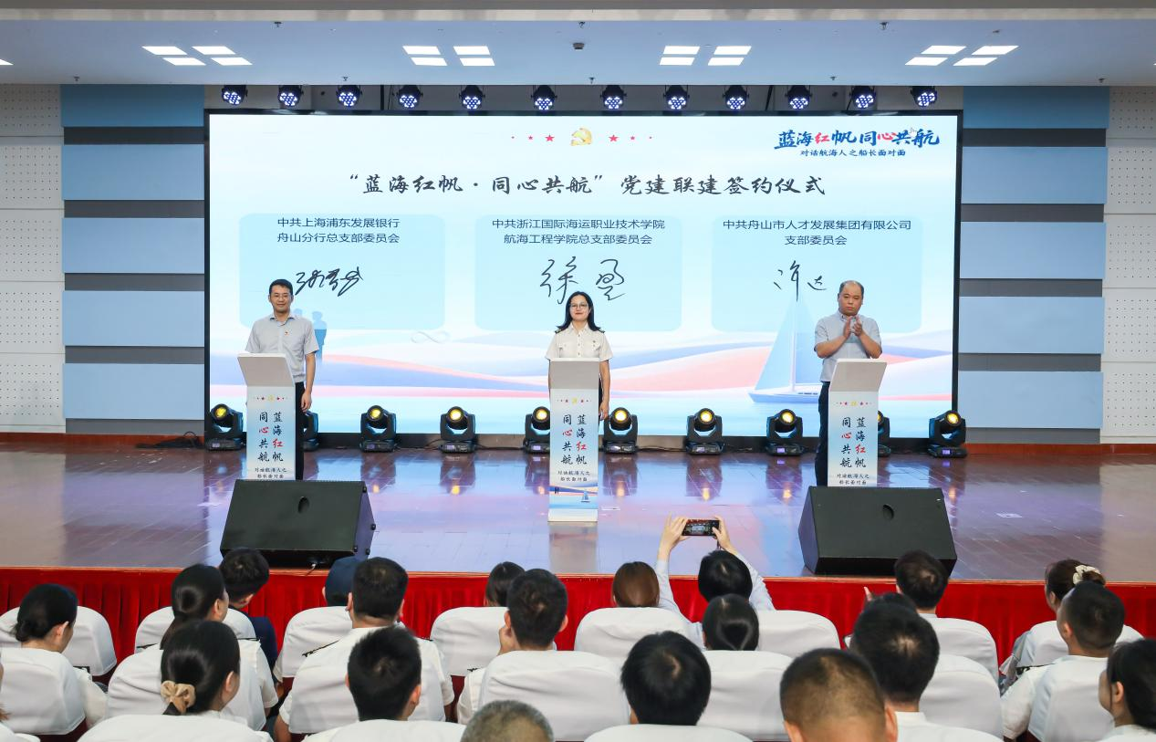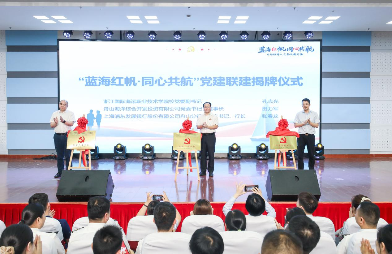 活动现场,市人才发展集团有限公司党支部、浙江国际海运职业技术学院航海工程学院党总支部、上海浦东发展银行舟山分行党总支三方签署党建共建协议,并由浙海职院党委副书记孔志光、舟山海投公司党委书记、董事长田力军、浦发银行舟山分行党总支书记、行长张春龙共同为“蓝海红帆·同心共航”党建联建项目揭牌,标志着三方协同发展迈出关键一步。