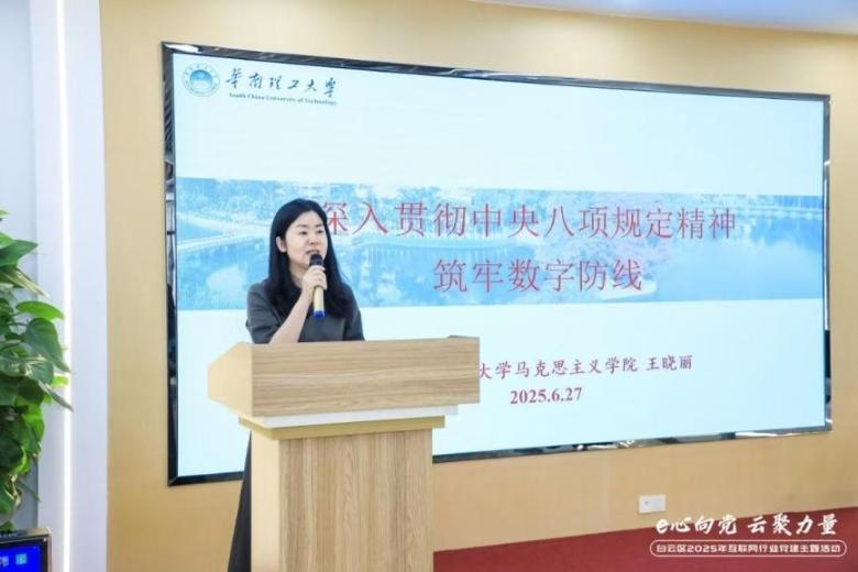 在开班仪式上,区委“两新”工委副书记、区委社会工作部副部长黄玮强调,要以党建引领夯实互联网行业发展根基,凝聚行业发展力量。华南理工大学马克思主义学院院长、博士生导师王晓丽教授作专题党课《严守八项规定 筑牢数字防线》,结合防范数据泄露、防范廉洁风险等案例,剖析“四风”问题新动向,阐述纪律红线对保障数智安全和行业健康发展的重要性。