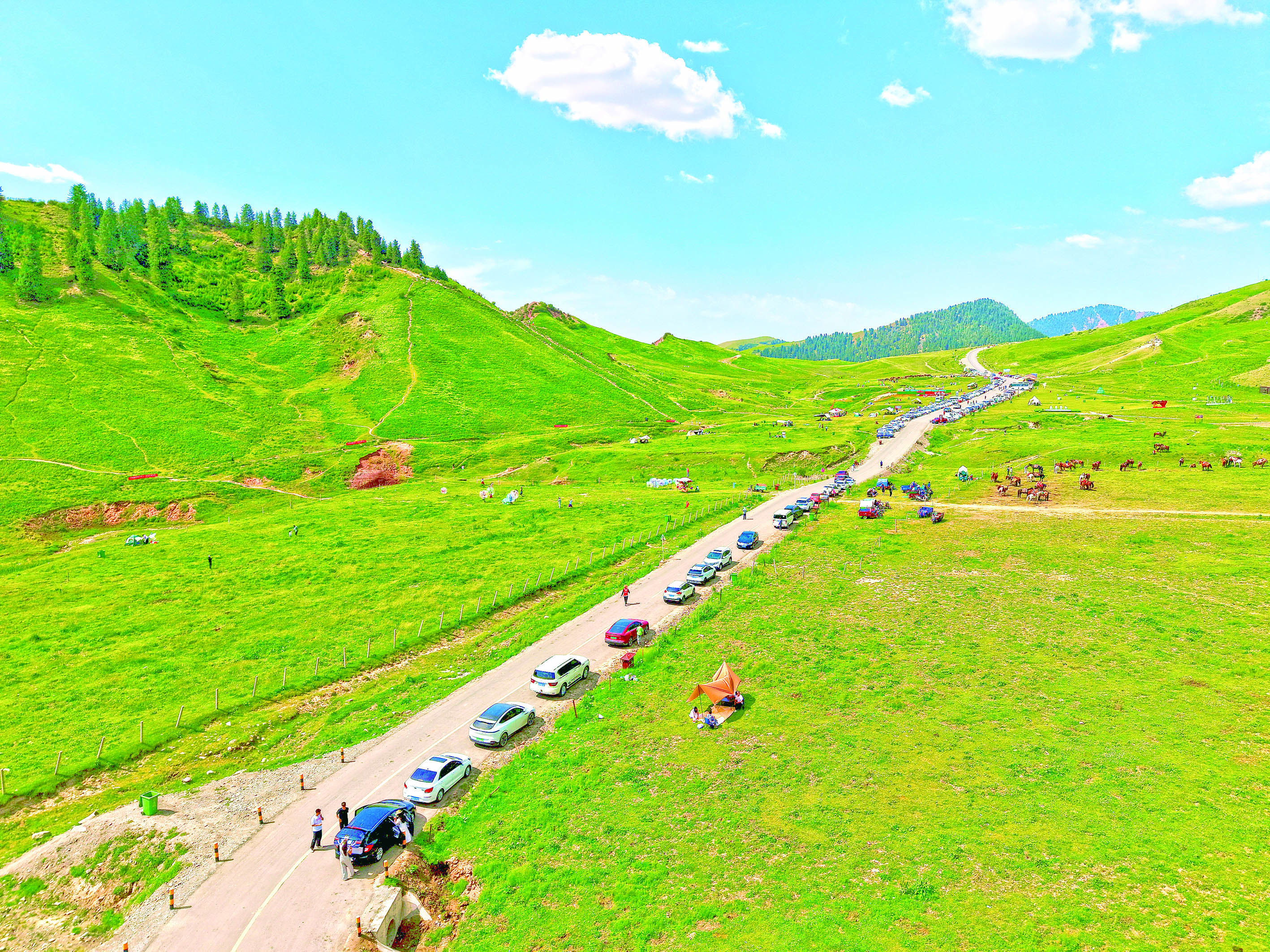 6月29日,游客在天山托木尔景区游玩。 通讯员 艾则孜·沙木沙克 摄