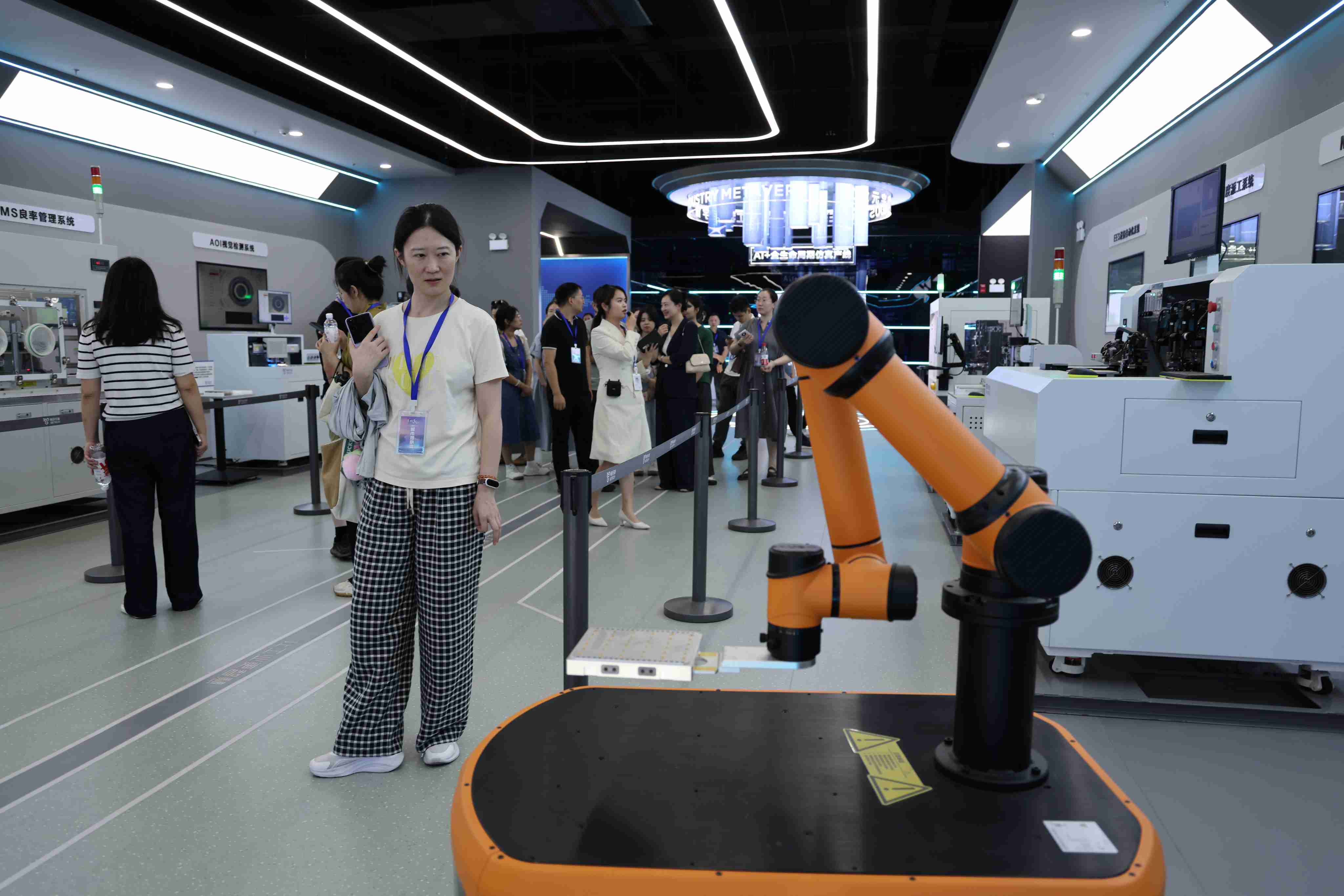 观察团成员在格创东智工业智能创新基地(武汉)观察智能设备活动的手臂。曹军 摄