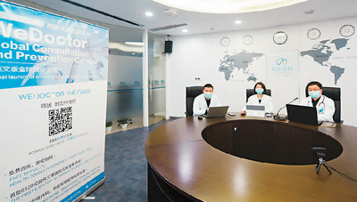 3月17日,中国医生在杭州通过微医全球抗疫平台为海外同胞提供免费在线咨询服务,指导如何进行科学防护。