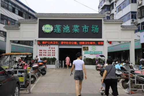 阜阳莲池菜市场,是阜阳首家“农改超”菜市场。菜市场内部明亮整洁,农产品摆放有序,按照“划行规市”的要求,共设置有蔬菜、水果、肉类、豆制品、水产、调味品、冷冻、干鲜等8个功能区。菜场落成后,因为服务水平的提升,即使人流量大,买卖也能条不紊的进行,在阜阳当地颇具好评。
