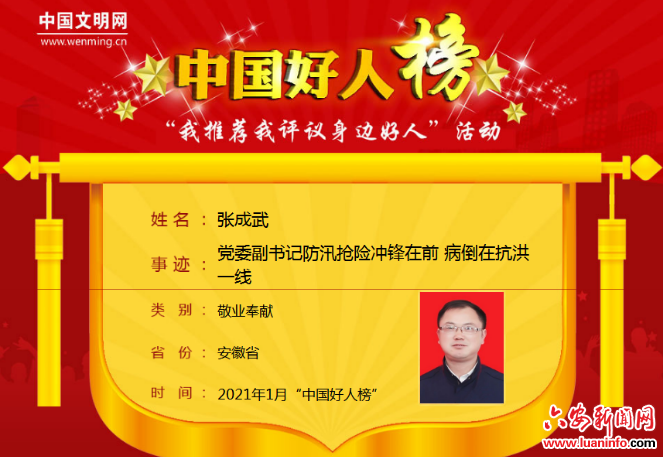 事迹简介:2020年夏天,突如其来的强降雨肆虐了江淮大地,7月18日,六安市金安区东河口镇的降雨量在4小时内突破了269毫米。面对严峻的防汛形势,张成武同志第一时间奔赴防汛现场,因劳累过度突发脑溢血,倒在了抗洪救灾第一线,经抢救无效于9 月13 日逝世,年仅46 岁。人民日报、新华社、学习强国、中国青年网、新安晚报、安徽文明网等多家媒体报道张成武的先进事迹。2020年8月,张成武当选“安徽好人”。