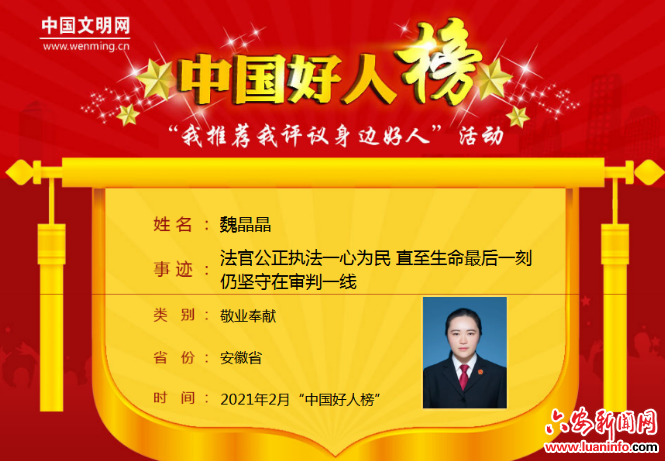 事迹简介:2020年12月10日下午,魏晶晶同志在工作时间突发疾病,经抢救无效于17时05分牺牲,年仅37岁的好法官永远地离开了她热爱并倾注了一生心血的审判工作,用生命谱写了一名共产党员、一名人民法官对党和人民的无限忠诚、对司法事业的无限热爱。2017年魏晶晶同志担任员额法官以来,先后主办及参加合议庭审结案件2062件,在平凡的岗位上作出了不平凡的业绩,曾先后荣获六安市“优秀公务员”、六安市中级人民法院“先进个人”、六安市中级人民法院“办案标兵”等称号。2021年,安徽省高级人民法院决定,为因公殉职的魏晶晶法官追记个人一等功,魏晶晶同志先后被追授“安徽省优秀共产党员”、安徽省“人民满意的公务员”、“安徽青年五四奖章”、“安徽省三八红旗手”、“六安五四青年”等称号。