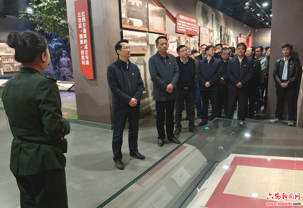 祭奠前,付新安一行来到大别山革命历史纪念馆进行了参观学习。从辉煌历史到浩气长存再到将军摇篮和红韵流长,付新安一行听得仔细,看得认真,并不时驻足凝视,到了十分感兴趣的地方,付新安还向随行人员进行深入细致地了解。