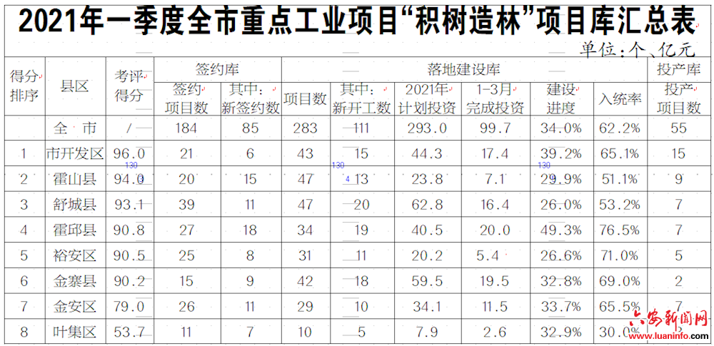根据“积树造林”工程考评指标体系,对一季度各县区工业投资增速、技改投资增速、签约数、开工数、投资进度、完成投资额、投产数、入统率等8项指标打分排序,得分由高到低依次为:市开发区96.0分、霍山县94.0分、舒城县93.1分、霍邱县90.8分、裕安区90.5分、金寨县90.2分、金安区79.0分、叶集区53.7分。
