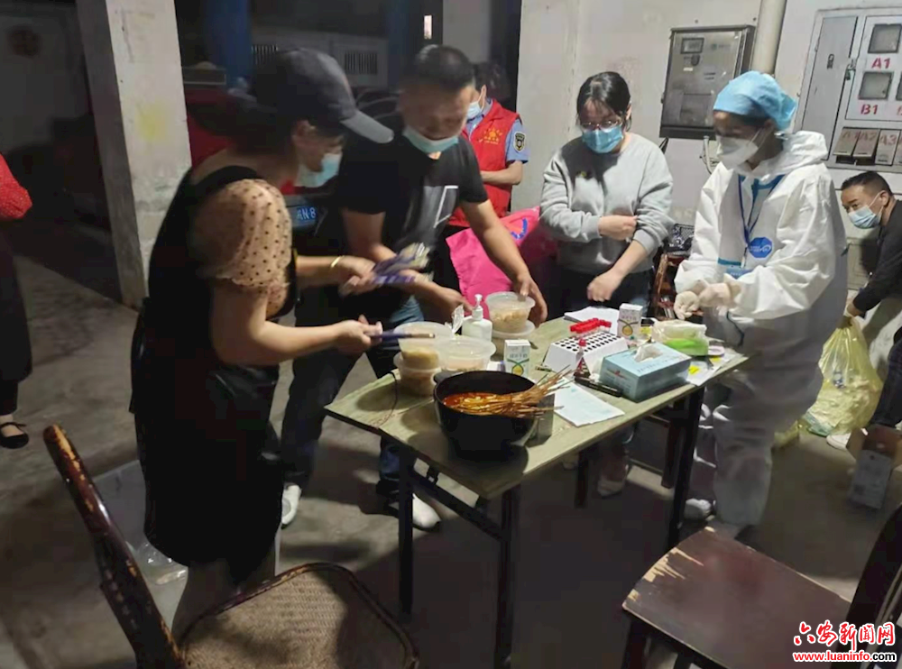 从5月14日中午开始,裕安区鼓楼街道庆安社区工作人员和霍邱县驰援六安主城区医护人员一起,坚守辖区核酸检测点,为居民开展全员核酸检测工作,彻夜不休。附近云路街宽窄巷子饭店在了解情况后,专门制作“爱心夜宵”,送给防疫人员。