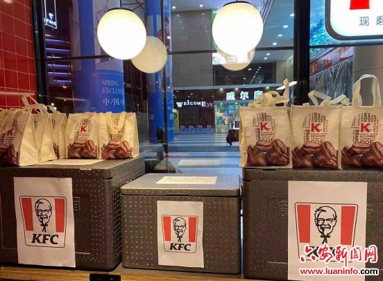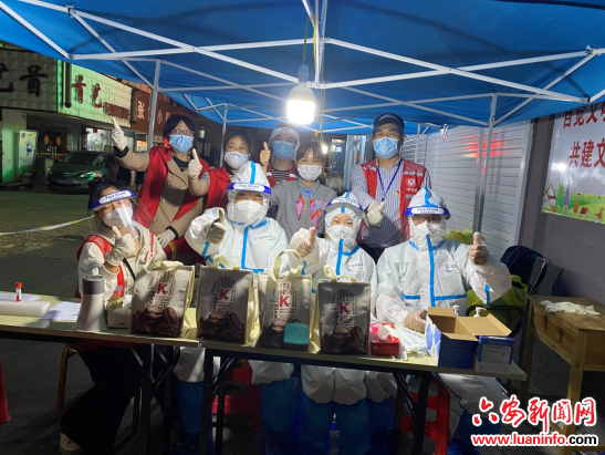 5月18日晚在六安锦绣花园采样点,肯德基皖西餐厅工作人员将热气腾腾的爱心餐送达采样点外面的桌子上,工作人员一边吃着肯德基餐点,一边竖起了大拇指。采样点工作人员告诉记者,“这份热乎的晚餐,让我们感到了社会对于我们的关心,再苦再累都很值得。我们会继续战斗在防控一线,保障居民健康。谢谢肯德基,你们是我们的坚强后盾。”当晚,肯德基工作人员为平桥南苑社区、长安城小区等9个采样点的工作人员送去了爱心餐。