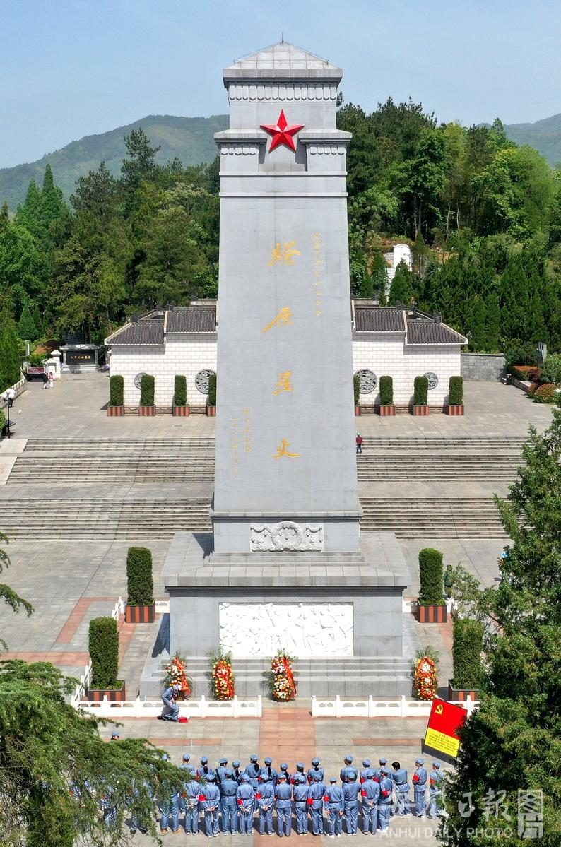 穿着红军装的青年在金寨县革命烈士纪念塔前接受红色教育