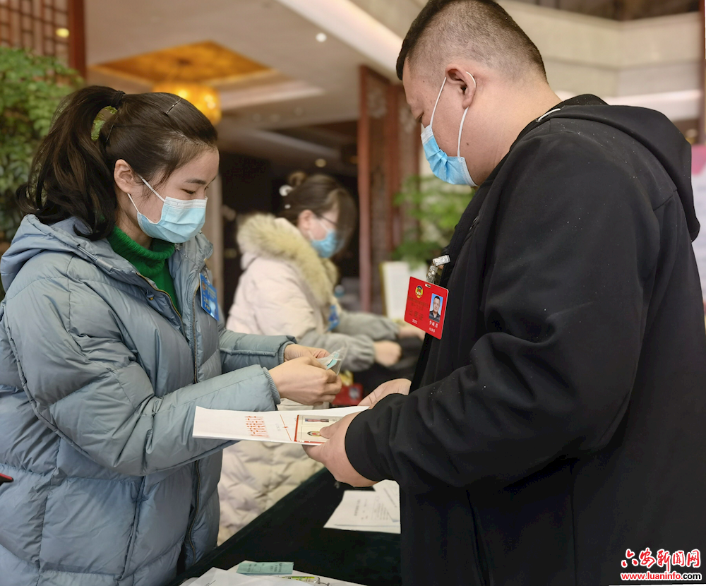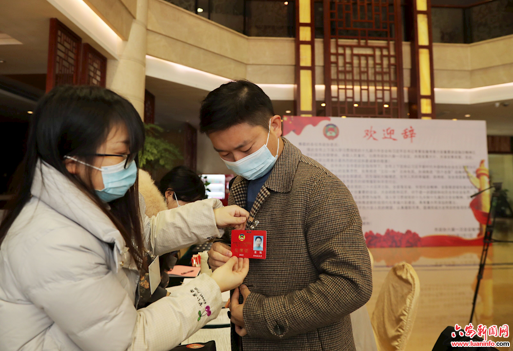 2月7日上午,在政协第六届一次会议的报到现场,工作人员为参会委员佩戴出席证。 (皖西日报融媒体记者 岳阳 摄)