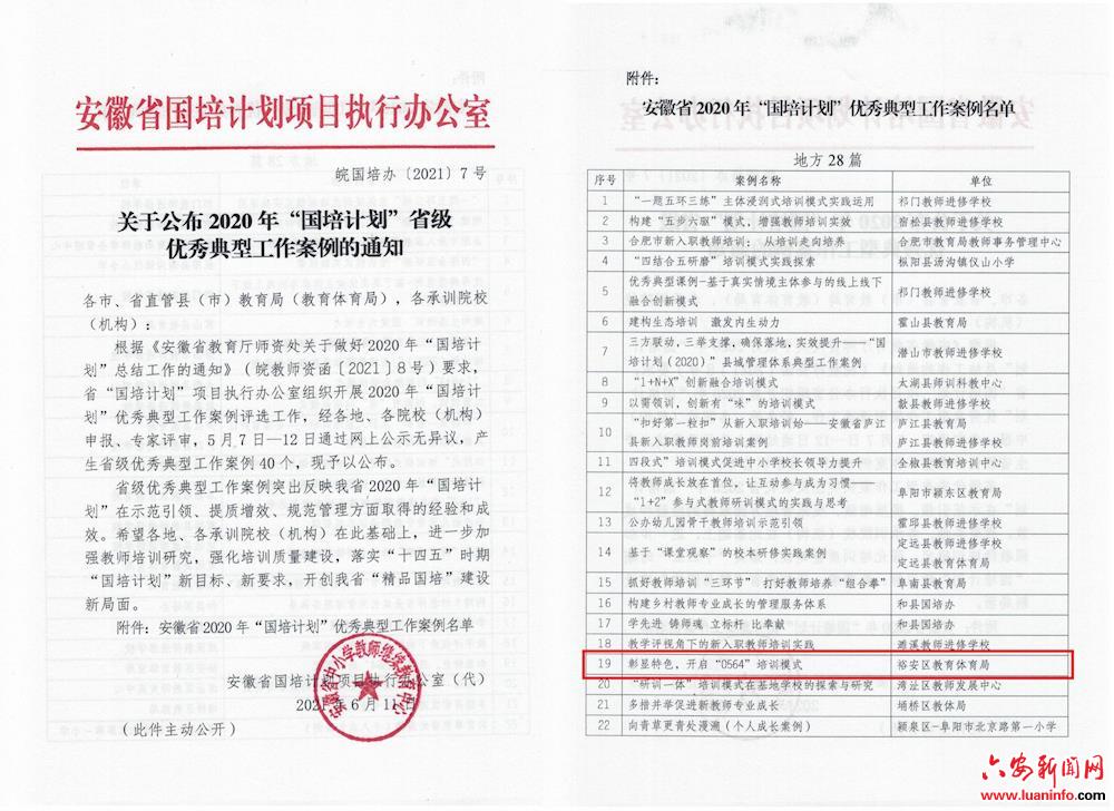 教育是最大的民生工程,教师队伍的整体素质直接影响到中小学校的教育教学质量。近几年来,六安市裕安区教体局从实施民生工程的高度,坚持以学生为中心,以教师发展为中心,促进“双减”等各项教育政策落地,结合当前正在开展的“以人民为中心的发展思想”专题学习教育活动,在实施教师培训项目时,善于总结经验,创新培训方式,探索推行教师培训“0564”模式,受到了安徽省“国培计划”项目执行办公室的表彰。