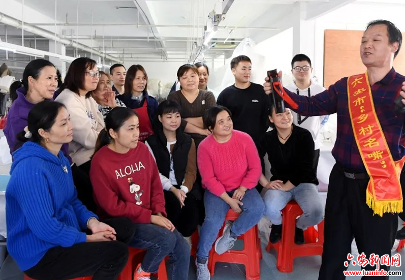 10月20日,来自叶集区的“乡村名嘴”张金波(右一)在裕安区丁集镇新时代婚纱厂的生产车间用快板书为工人宣讲党的二十大报告精神。