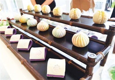 2020年8月,西安大明宫国家遗址公园的文创旗舰店“宫里东西”开业,上新了一系列以大明宫独有的盛唐文化为核心的文创产品。这些文创产品从宫廷器物、建筑、事件、人物中获取设计灵感,凝聚着大明宫独有的文化内涵。其中,各具特色的5款高颜值“唐菓子”成为了一大亮点。七彩茶味的“含元虹团”、神秘甜香的“紫宸夜月”、清香精美的“雅乐梨香”、多元口感的“太液碧波”,刺激着游客们的味蕾。“雅乐梨香”化用了唐玄宗创建梨园的典故,表皮用菊花针细致雕切,点缀金色糖珠,内馅佐以特调糖渍柚子果肉,形似梨花;“含元虹团”外皮用霓虹色,寓意含元殿的恢弘气象,搭配抹茶口味内馅;“紫宸夜月”的渐变蓝紫色外皮象征夜空,包裹有豆沙馅料,上印唐朝经典印花元素小团花,它的拱状造型则模拟了大明宫的殿上青瓦。