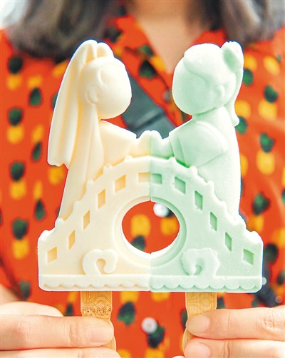 “断桥相会”款雪糕原型是许仙与白娘子的爱情故事,以情侣款亮相。拿着它走上断桥,把各自的一半合并一起,瞬间让吃冰变得甜蜜而有趣了起来。(图片来源:杭州西湖西溪景区官方公众号)