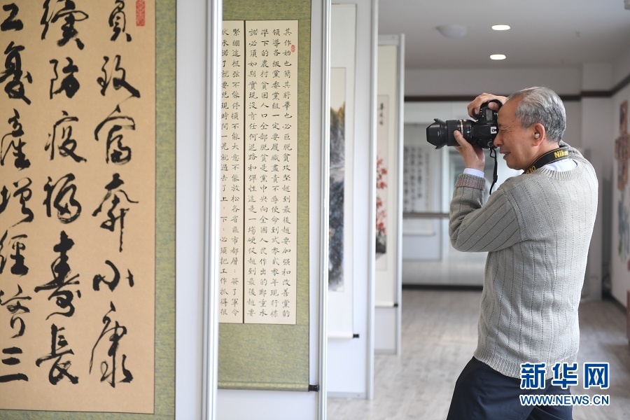 10月22日,在重庆市九龙坡区老年人活动中心,一位老人正在拍摄书画展。新华网 彭博 摄