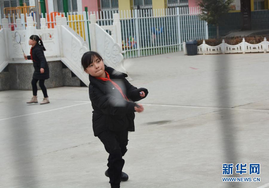 12月1日,在广河县三甲集镇火炬小学的操场上,马梅在课间和同学打羽毛球。新华社记者颜之宏摄