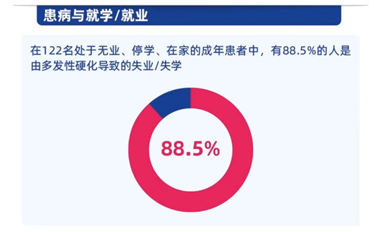 由于多发性硬化是一种严重、终身、进行性、致残性的中枢神经系统疾病,诊治不及时可导致患者出现瘫痪、失明等严重残疾。《报告》结果显示,超过43%的患者生活不能完全自理,需要他人照顾,高达88.5%的人因患有多发性硬化而失业、失学,我国多发性硬化诊疗水平亟待提高。