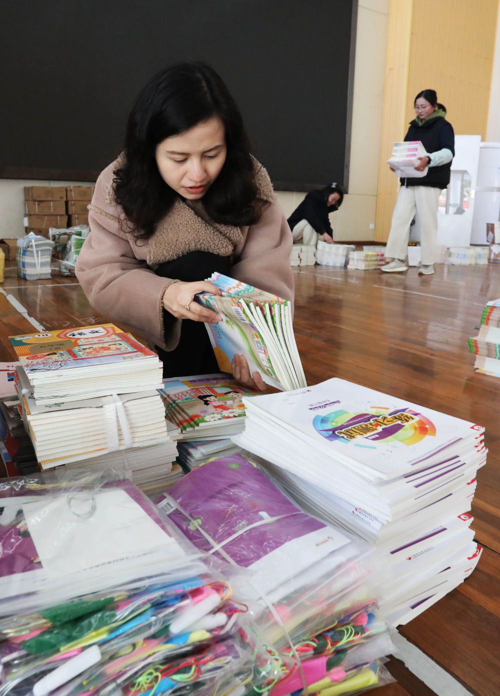 2月1日,江苏苏州东中市实验小学校的老师在整理新书。新华社发(杭兴微摄)