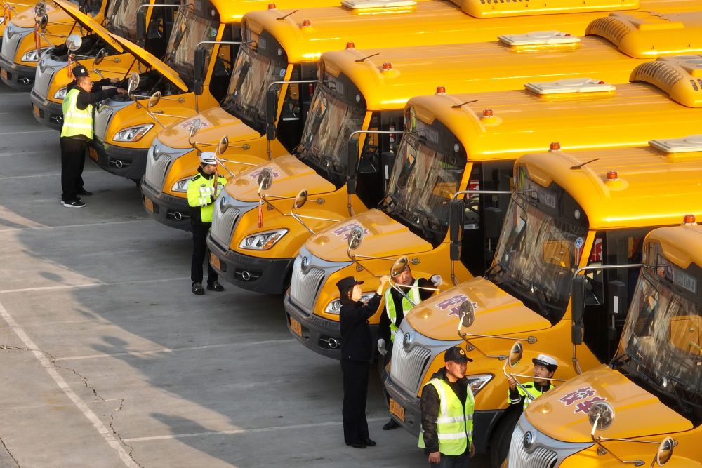 2月1日,江苏省扬州市宝应县公安局的交警对辖区校车进行检查(无人机照片)。新华社发(沈冬兵摄)