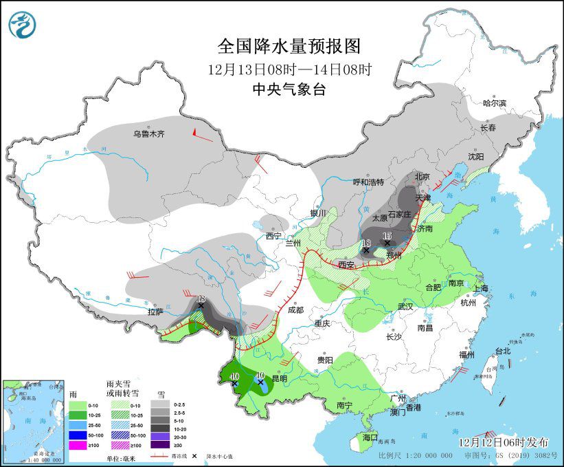 12月13日08时至14日08时,新疆中东部、西藏东部、川西高原南部、西北地区南部和东部、内蒙古大部、东北地区中南部、华北、黄淮北部和西部等地部分地区有小到中雪或雨夹雪,其中,西藏东南部、华北南部、河北中南部、河南北部和西部等地部分地区有大到暴雪(10~18毫米)。云南大部、贵州南部、四川盆地东北部、湖北、湖南北部、安徽、山东中南部、江苏、广西大部、广东西部、海南岛大部等地部分地区有小到中雨,其中,云南西南部和中部等地局地有大雨(25~40毫米)。内蒙古西部、西藏中北部、陕西南部、川西高原、云南东北部等地部分地区有4~6级风,其中,新疆东部部分地区有7~8级风。
