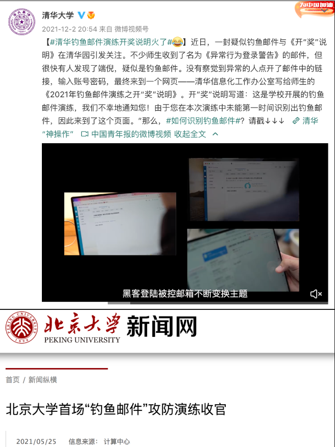 2021年,清华大学和北京大学陆续进行了“钓鱼”邮件演练。北京大学称: