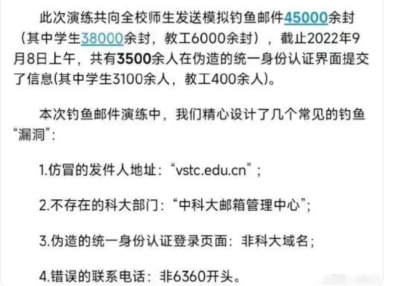 演练当天,共有4万余名师生收到这封模拟“钓鱼”邮件,54%的师生阅读了邮件,其中约5000名师生点击了可疑链接,约2000名师生在后续登录页面输入了用户名和密码。