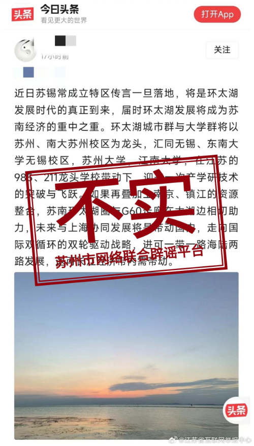 苏锡常将设立经济特区? 编辑:高方勇 来源:@江苏省互联网举报中心 浏览次数: 次 发布时间:2023-10-18 15:56:02 【字体:小 大】 近日,有网络传言称“苏锡常将设立‘经济特区’”,经向有关方面了解,此信息内容不实,为个别网民杜撰编造。请广大网民不信谣、不传谣! 扫一扫在手机打开当前页 【打印正文】 相关信息 上一篇:“公交车起火致2死5伤”?警方通报 [ 2023-10-18 ] 下一篇:仰头玩手机,是否真的对预防颈椎病管用?专家紧急提醒 [ 2023-10-18 ]