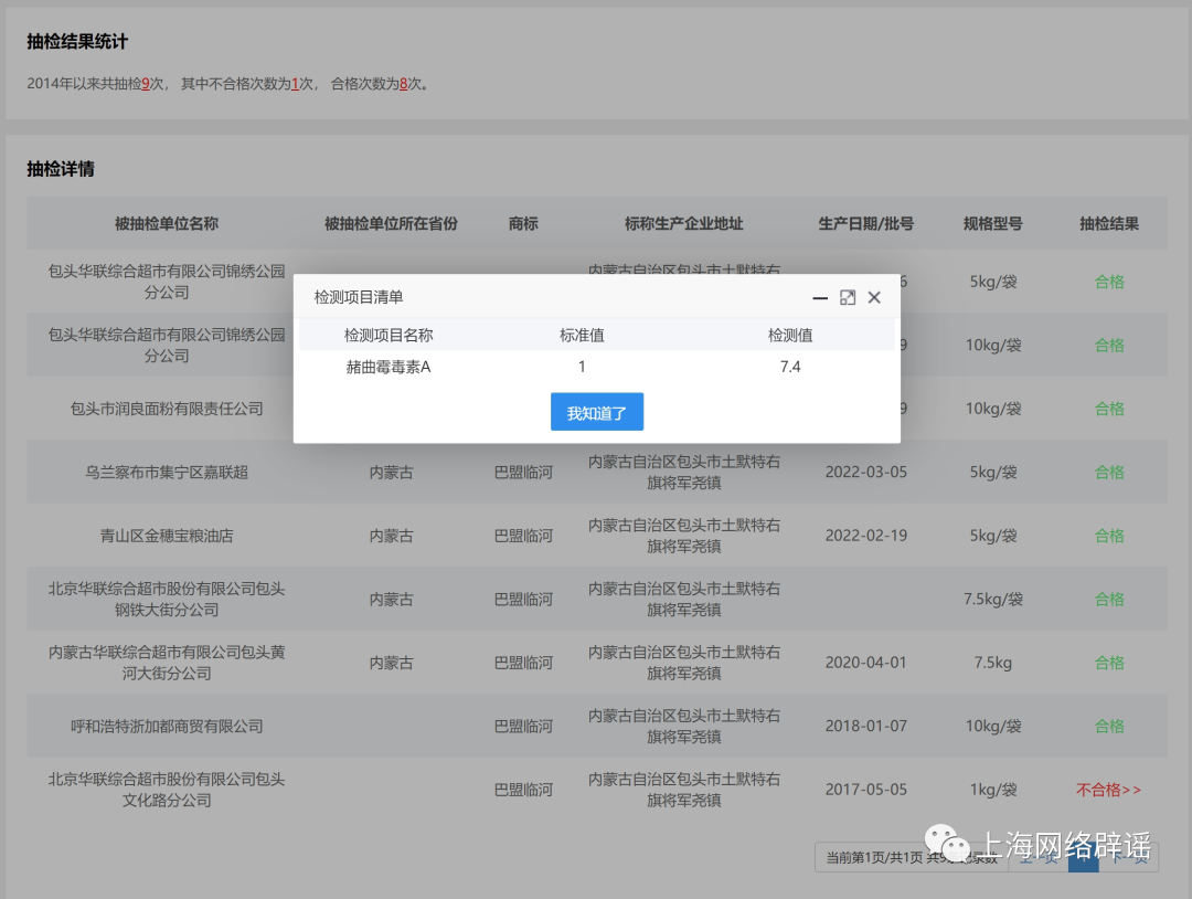 那么,市场上的小麦粉质量又如何呢?国家市场监督管理总局食品安全抽检公布结果查询系统显示,有关“小麦粉”的合格产品有4292条,不合格产品仅53条,而这53批次不合格产品的主要问题是霉菌毒素超标,与添加剂无关。