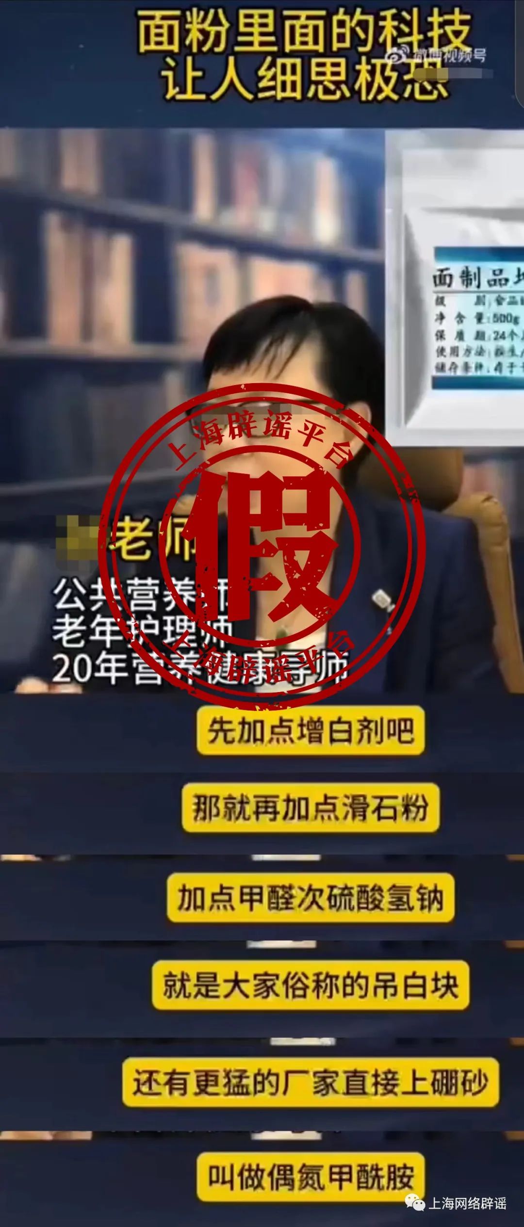 例如,近日网上流传的一段视频中,一位标注为“**老师”的主播说:“面粉中含有增白剂、滑石粉、甲醛次硫酸氢钠(吊白块)、硼砂、偶氮甲酰胺等多种添加剂,让人细思极恐。”
