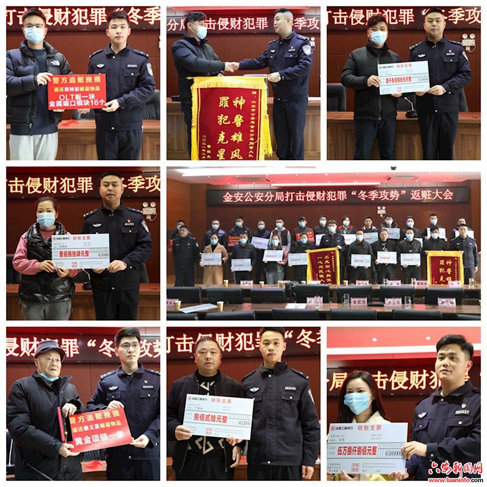 为深入推进打击侵财犯罪专项行动,提升群众安全感、满意度,2月10日上午,市公安局金安分局召开打击侵财犯罪“冬季攻势”集中返赃大会,将涉案价值近80万元的赃款、赃物返还给了受害群众,赢得群众的一致好评,有的群众现场送来了锦旗,表达感激之情。