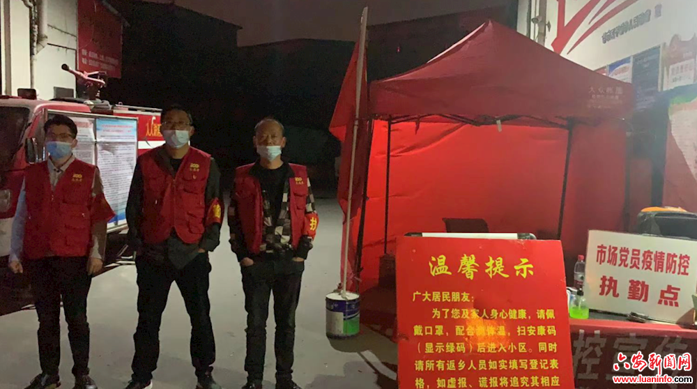 情况紧急,裕安区大别山义乌批发市场党总支迅速行动,立即成立党员志愿者疫情服务队,这支由党员同志组成的40人的队伍,承担起市场内疫情防控,秩序维持、消防安保等事务,人员分为三班,确保日夜不间断,为市场经营者提供必要的服务,保障市场内疫情防控工作,稳定了经营户们的情绪。