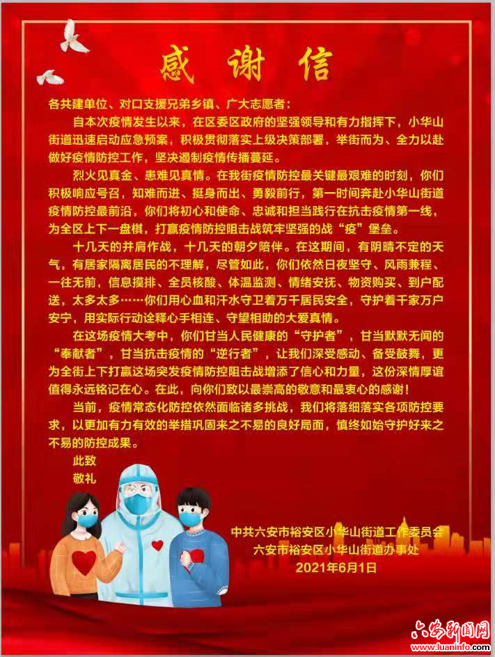 来自裕安区小华山街道的一封感谢信 编辑:赵璐 来源: 浏览次数: 次 发布时间:2021-06-02 20:15:00 【字体:小 大】 扫一扫在手机打开当前页 【打印正文】 上一篇:舒城县城关镇飞霞社区党史学习出新招 [ 2021-06-02 ] 下一篇:“红色代办”打造基层便民服务新模式 [ 2021-06-03 ]