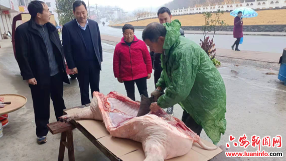 2022年1月5日,新年伊始,在金寨县花石乡黄堰村驻村工作队牵线搭桥下,农业银行安徽省分行赴结对帮扶村开展爱心助农.帮销农产品活动。帮扶单位负责同志从合肥驱车200余公里,帮助花石乡黄堰村脱贫户销售黑毛猪一头,带动该户增收5000余元,稳固了该户脱贫成效。