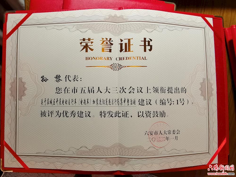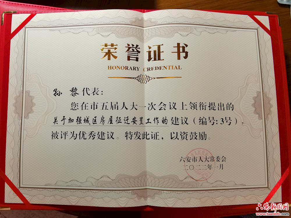 日前,正在参加市“两会”的人大代表孙黎收到了7份来自六安市人大常委会颁发的荣誉证书,其中优秀议案3项,优秀建议4项。