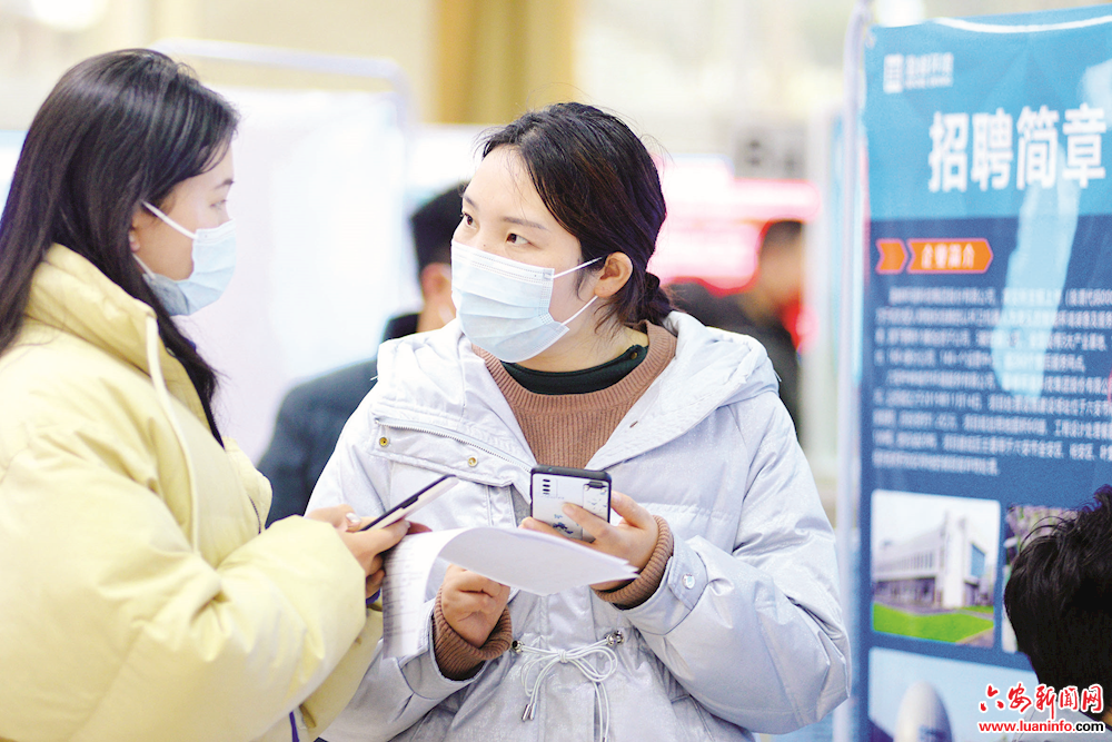 2月12日,市“春风行动”首场线下专项招聘会现场,企业工作人员在向求职者介绍用工信息。(皖西日报融媒体记者 田凯平 摄)