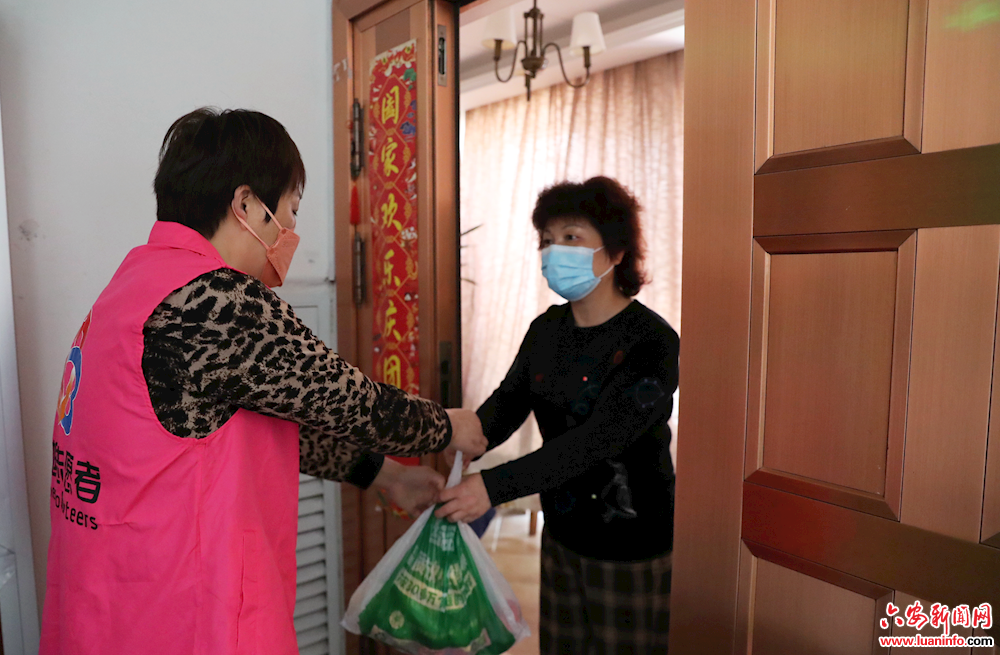 4月6日下午,裕安区小华山街道六梅路社区的志愿者将小区住户所需的蔬菜等食品送到家门口。为了积极响应防疫要求,加强对小区的闭环管理,社区工作人员以及志愿者劝导住户尽量不出门、少出门,物资到达防疫检查站时,由志愿者送到小区住户家中,降低接触产生的风险。 (皖西日报融媒体记者 岳阳 摄 )