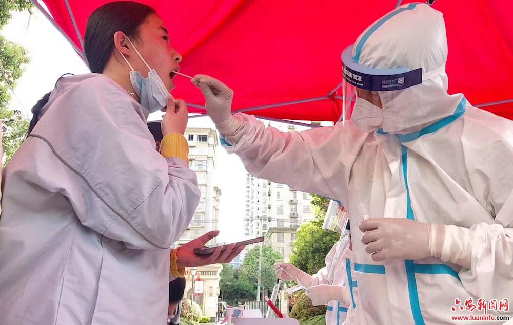 “您好,帅哥,能不能麻烦您稍等一会儿,这有一位高三学生,能不能跟您商量一下让她先做核酸好么,她们学校的网课已经开始了,快高考了时间很紧张,谢谢啦!”4月6日,位于裕安区城南镇东方红社区凯旋观邸小区的核酸采样点如前日一样分楼栋按一米线要求排起了核酸检测的队伍。在志愿者的沟通协调下,一位高三女生从队伍的后面径直走到采集区前台,扫码、取样一气呵成完成了核酸检测。