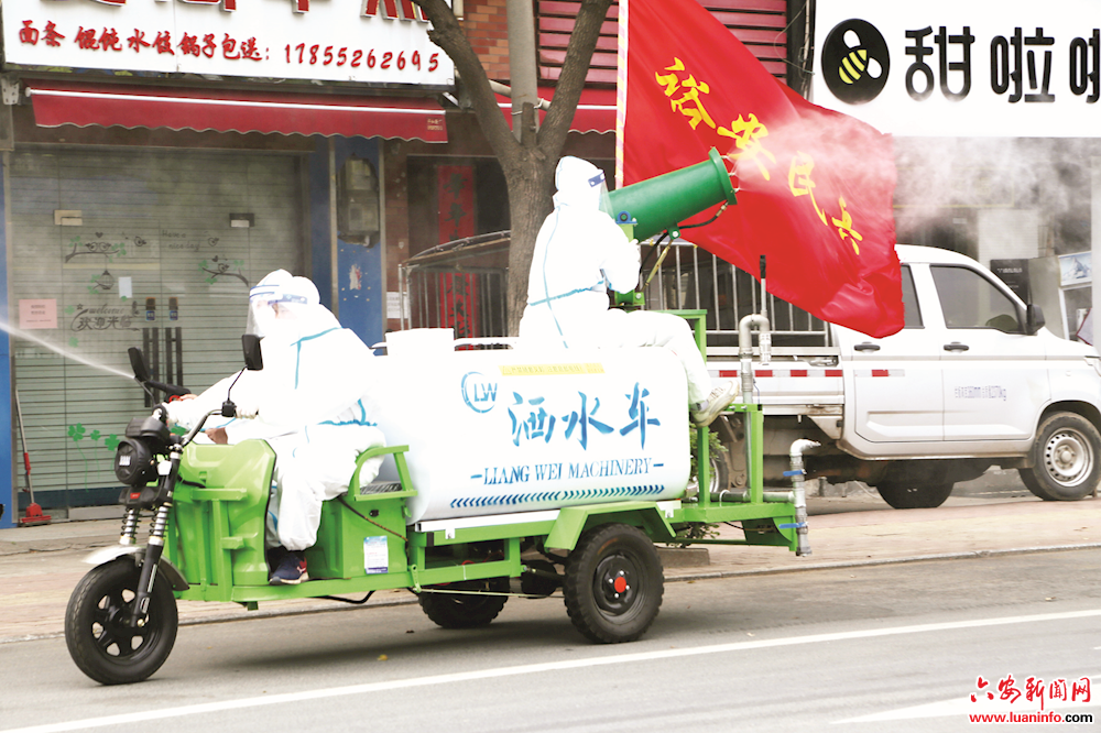 2022年4月20日,六安市裕安区民兵应急连35名民兵,继续奔赴该区苏埠镇、城南镇等多个出现新冠肺炎病毒核酸检测阳性病例的街道、乡镇,对小区、路面、楼栋、农户进行全面消毒消杀。