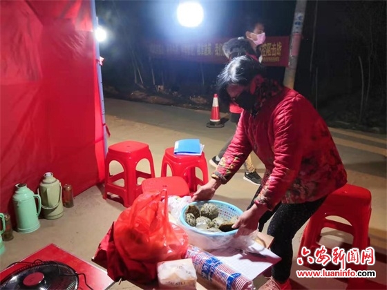 “爱心捐献——你们为党、为人民,不顾自己生命、不顾冷热,坚守岗位,做好防控工作,保护人民健康安全,你们辛苦了,20个农家蒿子粑粑,略表心意,请收下吧。”一张看上去有点皱的信签纸上写道。日前,杨集村的爱心村民端着一盆刚出锅的蒿子粑粑来到杨集村卡点,为夜以继日坚守在杨集村卡点的“战士们”送上一份特别的“夜宵”。“冬日里的温情”在分路口镇的防“疫”战场上并不鲜见,在该镇的各大卡点值守处,爱心群众有的送开水,有的送水果,有的送炭火……在这场没有硝烟的阻击战中,全镇上下齐心、众志成城。(皖西日报融媒体记者 张世巧 通讯员 吴俐)