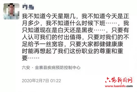 2月7日凌晨1:23,金寨县疾控中心一位从事流行病调查工作的同志在微信朋友圈写下这么一段话:我不知道今天是星期几,我不知道今天是正月初几,我不知道什么时候下班……我只知道现在是白天还是黑夜……只要有人认可我们的付出,再辛苦也值得……。这时大家都已经沉浸于梦乡,一位新冠肺炎疫情防控流调工作人员才忙完一天的工作。
