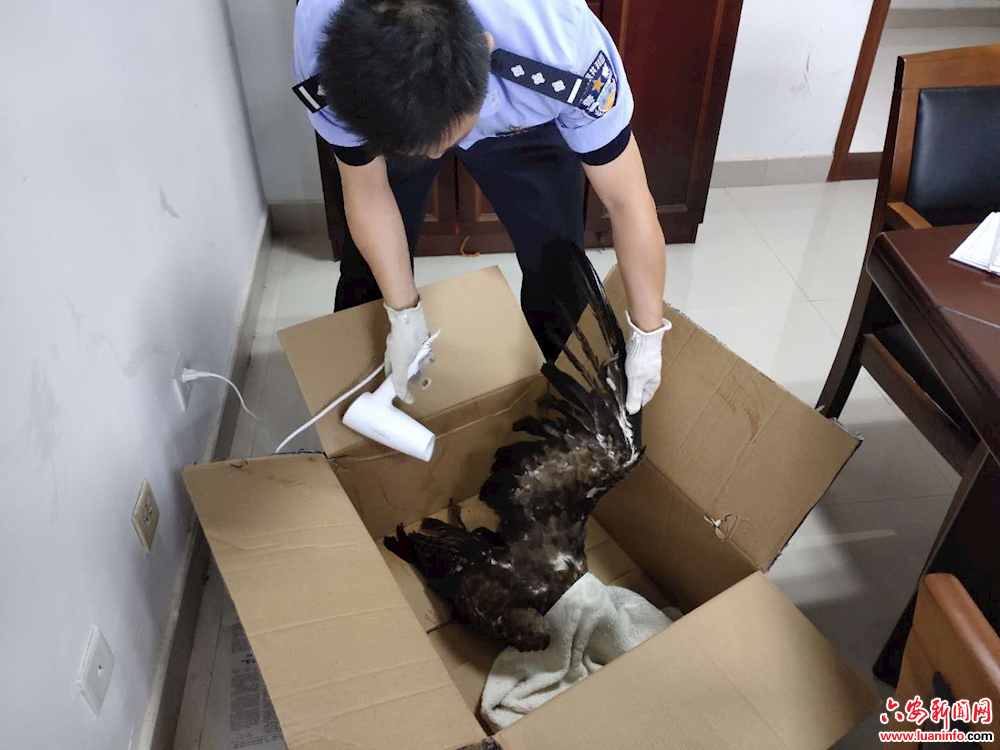 接警后,金寨县公安局麻埠派出所民警立即赶往现场,将落水老鹰救起后带回派出所进一步观察,发现老鹰身体被水浸泡后体力透支,民警随即将老鹰翅膀烘干,待体力恢复后进行喂食,经动物专家鉴定该老鹰学名为黑鸢,属于鹰类,为国家二级保护动物,当晚民警将其带往山林,放归大自然。 (储旭 曹阳)